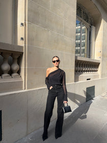 Karen is wearing the Bodysuit from the Twinsparency set with a linen black loose trousers and sandals to run around the city.